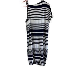 This casual sundress by Trina Turk features a striking black and white striped pattern with an asymmetrical cowl neckline and short sleeves. The dynamic stripes create a flattering silhouette, while a solid black band at the waist accentuates the figure. Perfect for a relaxed yet stylish look.
