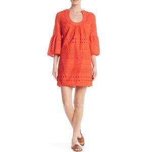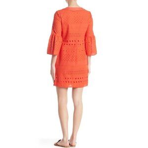 A sweet embroidered shift dress featuring bell sleeves & an allover embroidered eyelet design.