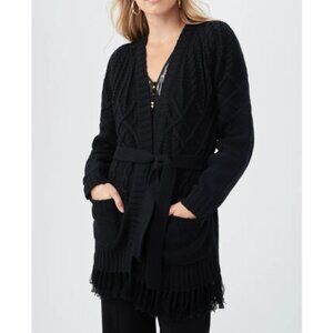Trina Turk 'Bourdele' cardigan sweater featuring a textured, chunky rib-knit, belted waist and playful fringe-trim.