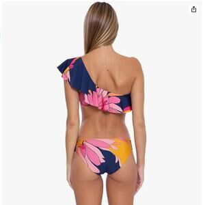 One-shoulder|Asymmetrical top ruffle|Pull-on style|Runs small; see SIZE CHART |Model is 5'10" wearing size 4|Swim tops and bottoms are sold separately|Due to its large print each garment will have a unique pattern placement.|83% Nylon 17% Spandex Lining: 84% Nylon 16% Spandex|Hand wash cold|Imported