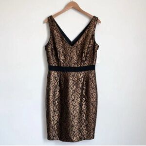 Look Classy and slightly Flashy at your next special occasion in this beautiful Gold and black brocade metallic Midi Dress‼️dress features back zip closure, sleeveless V-neck front, and polished tailoring with the elegant black grosgrain waistband. Very unique design and fabric. EUC. Size 12. 👑