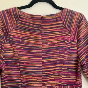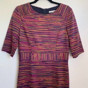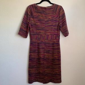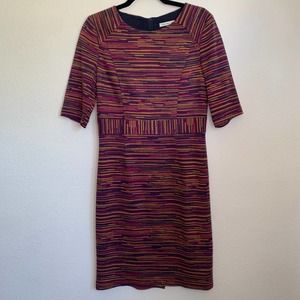 Trina Turk, short sleeve lined burgundy, navy tan dress size 8 missing size tag warm, professional, comfortable dress