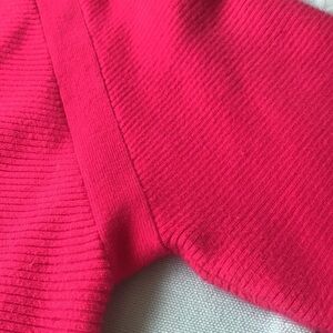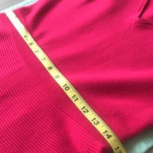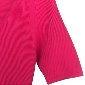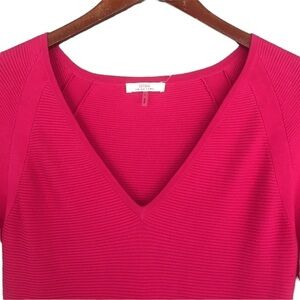 Trina Turk, Candence, fit & flare sweater dress. Ribbed/ottoman stitch. Style TT150906. V neck. Elbow length sleeves. 80% cotton 18% polyamide 2% spandex. Size large. See photos for measurements to ensure fit. Used condition as dress does show some wear. Last two photos show fit. Color of the dress for sale is pink.