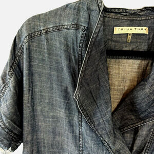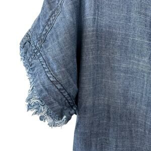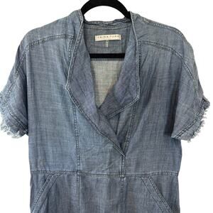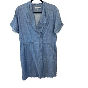 Trina Turk Chambry Lightweight Popover Dress Blue Frayed Hemline Linen Blend M