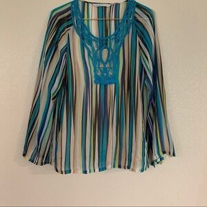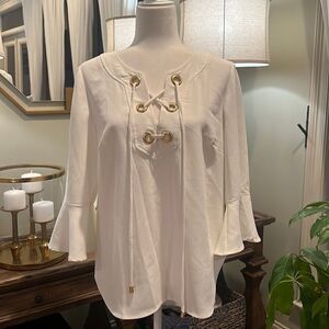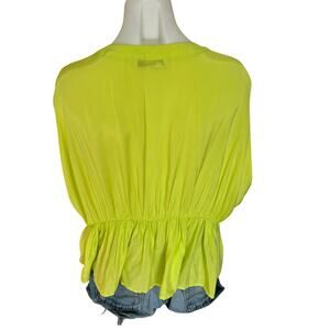Cute chatreuse top that goes so perfect with jeans, flattering cut with a cinched elastic waist , gathered sleeves and peplum hem . Perfect vacation weekend top