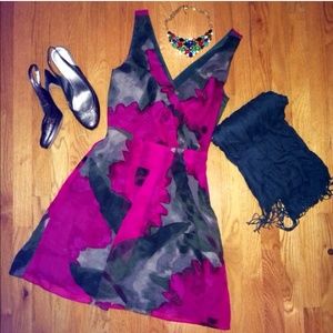 Like new condition, beautiful pink/ gray printed silk Trina Turk dress with lining. Deep V neck front & back. Fitted bodice with a flowing skirt. Perfect for a date night, cocktail party, or wedding. Like most things in my closet, worn only once!