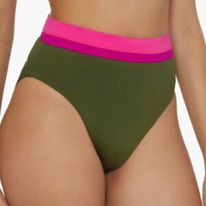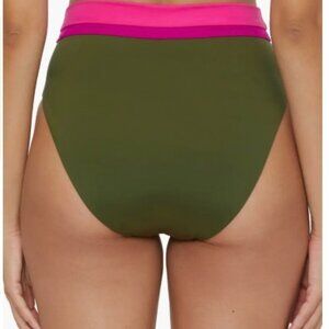 Take a dip or make a splash in these vibrant high-waist bikini bottoms by Trina Turk. Designed in an olive multi colorblock palette with bold pink accents, these flattering bottoms offer a modern silhouette with moderate coverage.