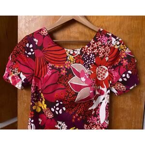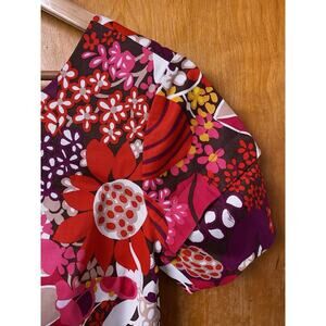 New with tags attached. Red/purples/yellow floral printed dress with seamed puff sleeves. Back zip, full lining with lace hem detail.