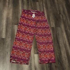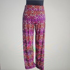 Bold and stylish wide leg pants. Features a vibrant pattern with purple, pink, and orange tones. Perfect for making a statement.