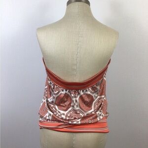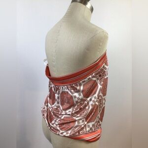 Chic strapless top with coral and cream geometric design. Ideal for summer wear. Layer great on the body. Quality buy. Stay up. 100% silk. Made in USA. Dry clean.