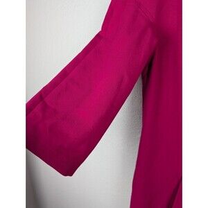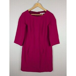 This Trina Turk dress features a stylish shift silhouette in a vibrant pink magenta color. It has 3/4 sleeves and a round neckline. The dress is made from a polyester blend knit fabric in size 4 and a short length. Perfect for parties, casual outings, or business events.