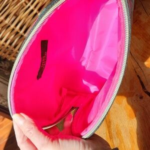 pink, green, black, gold zipper and pull. Pink lining. 100% pvc.