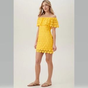 Chic yellow off-shoulder lace dress. Perfect for summer outings or après swim. Poly so fine when wet!