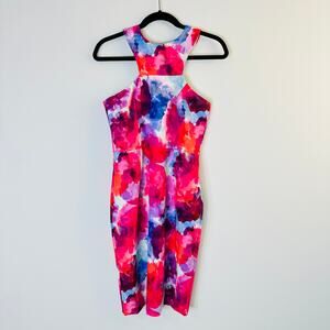 Trina Turk Delano Watercolor-Print Racerback Sheath Dress. Size 4. In excellent pre-owned condition. Round neckline; button-keyhole back. Sleeveless; cut-in shoulders.