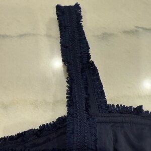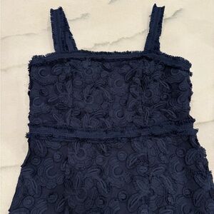 Trina Turk Dress Size 6 Navy Blue Textured Floral Embroidered Fringe Trim