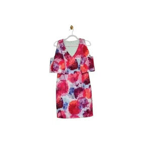 This beautiful Trina Turk dress features a stunning pink floral pattern on an oakhurst colored background. The dress has a V-neckline, short cold shoulder sleeves, and a zip closure. It's perfect for a variety of occasions, including travel, weddings, and cocktail parties. The dress is made of a blend of polyester and spandex, and is dry clean only. It's a size 8, and has a sheath style with a short length. The dress is lined, and has a designer, colorful, and preppy theme that will make you stand out in any crowd. It's suitable for summer, fall, and spring seasons.