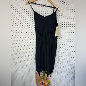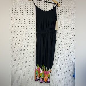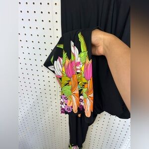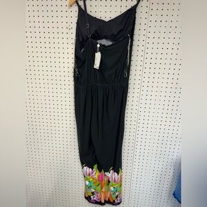 Chic black jumpsuit with colorful floral design. Features a halter neckline and cropped legs. Ideal for stylish outings.