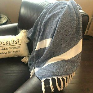 Trina Turk Fringe Throw Blanket Navy Blue White