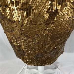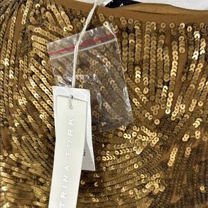 Turn heads in this stunning Trina Turk gold sequined sheath dress, a timeless piece designed to bring glamour to any evening event.