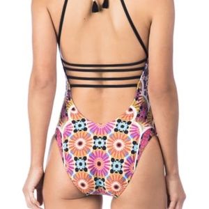 A mosaic of floral prints brings signature Trina Turk style to a sultry one-piece cut with crisscrossing straps and a halter neckline.