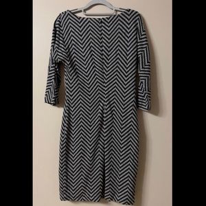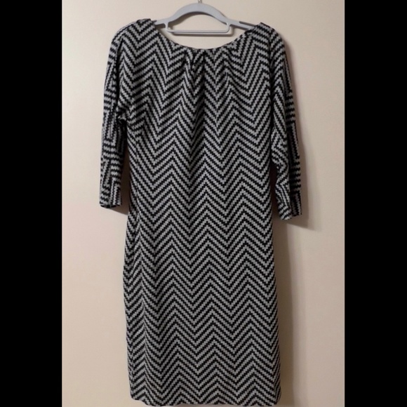 Another great Trina Turk dress — body skimming, knee-length, with elbow-length dolman sleeves and a gathered neckline. Back zipper and fully-lined body. The black and gray chevron / herringbone pattern is both graphic and subdued, professional yet not boring. Super-flattering, comfortable, and so easy-to-wear! In excellent condition.