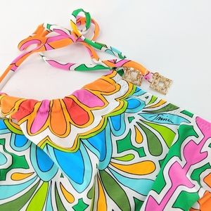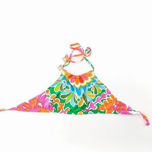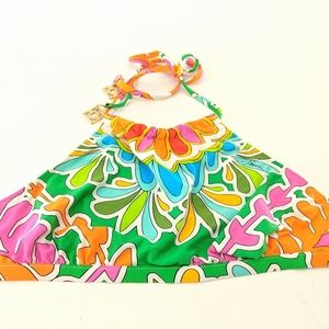 Trina Turk colorful psychedelic print halter bikini top. Beautiful bright tones of green, pink and blue In an abstract 60s style print.