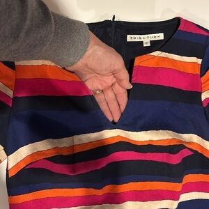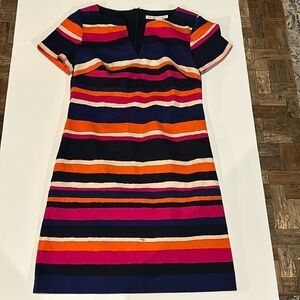 Trina Turk Horizontal Stripe Sheath Shift Dress. Colorful horizontal stripes. Cap sleeves. Lined. Back zip closure. V neck. Size 2