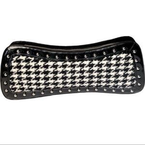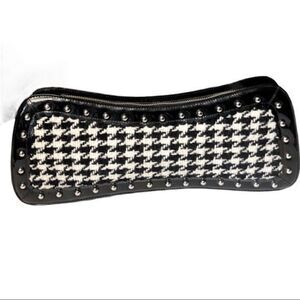 The Trina Turk Houndstooth Clutch is ideal for any event or occasion. This stylish handbag features a timeless houndstooth fabric design that’s sure to impress. Whether attending a formal event or just heading out on the town, this clutch will give your wardrobe a chic and sophisticated flair. Silver tone studs with scallop edging. Never used... very good condition. Measurements Appox 6” width, 15” length.