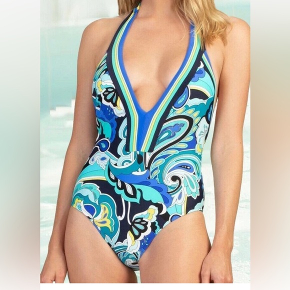 Trina Turk Ipanema Plunge Tropical Halter One Piece Swimsuit Bathing Suit Size 6