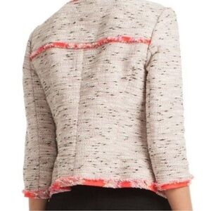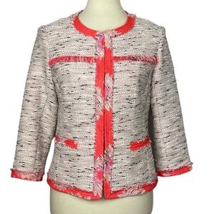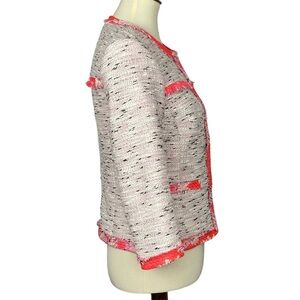 Trina Turk Jacket Womens 2 Ivory Black Coral Pink La Brea Texture Jacquard Fringe. 3/4 Length Sleeve. Not-lined. Very Good Pre-owned condition. No found flaws or stains. See photos for measurements. Ships quickly from smoke-free home.
