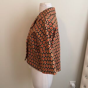 Red, black , tan and brown all over geometric print. Cropped silhouette. Button front closure, Wide 3/4 length sleeves. Notched collar. Lined. 19” shoulder to bottom. 21.5” armpit to armpit. NWT