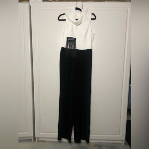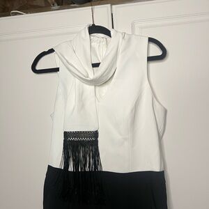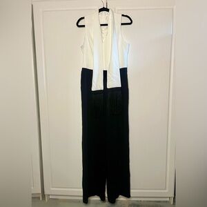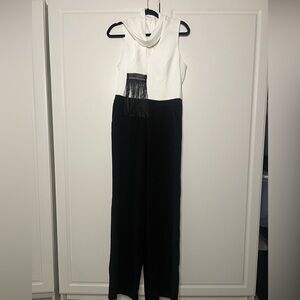 Cool white and black jumpsuit with v neck and attached scarf with black fringe. There are a couple small stains towards the bottom of the white top of the jumpsuit, as photographed. I have not dry cleaned this item to attempt to remove them. US size 6.