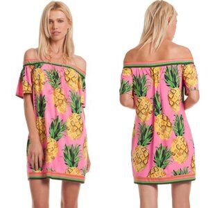Trina Turk Kelso Pineapple Dress Off The Shoulder Short Sleeve Sheath Pink/Yellow Strapless M