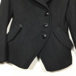 Black fitted heavyweight winter coat in good condition. Please note this jacket did have three accent buttons adjacent to the working buttons which have been removed, see last pic. Satin lining. Fine lambswool blend. Trina Turk tag size 6. Large black shank buttons. Longer in the front straight at the back hem. Spare button attached to fabric label.