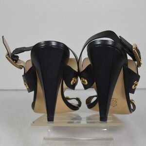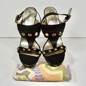 These striking black leather sandals by Trina Turk feature gold-tone grommet embellishments and a stylish 4-inch cone heel. Designed with a metallic gold leather lining and an adjustable ankle strap with buckle for a secure and elegant fit. Perfect for elevating any dressy look.