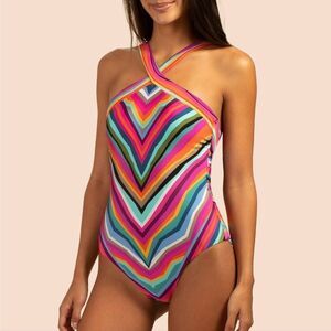 Trina Turk. Louvre high Neck Reversible One Piece Swimsuit. Louvre Print Swim Knit. Colorful and sexy, this rainbow-soaked one-piece swimsuit is the perfect choice for your next beach vacation. Flattering mitered stripes highlight your best assets while adjustable sash ties create the perfect fit.