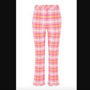 Trina Turk Lulu Pink Yellow White Plaid Tweed Fringe Pants 0. A cropped length and kick-flare hem give these tailored pants a playful touch and just the right amount of flair.