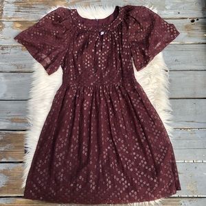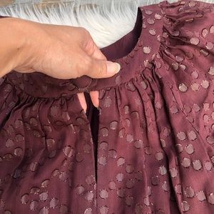 Maroon spotted silk dress with neckline button, flutter flowy sleeves give it a vintage look.
