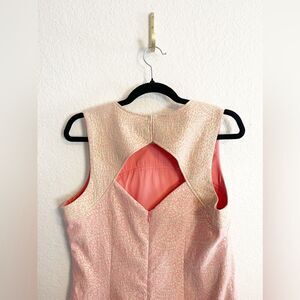 Shift dress in pink and metallic gold. Has a retro style. Key hole detail in back. Ptp 18, waist 16”, hips 19”, length 38”. Questions? Leave a comment below!