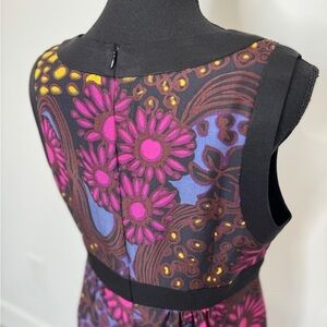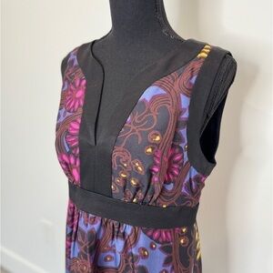 Beautiful vibrant colors on this floral print dress by Trina Turk. The base color is black. This dress is lined and has a hidden zipper at back.