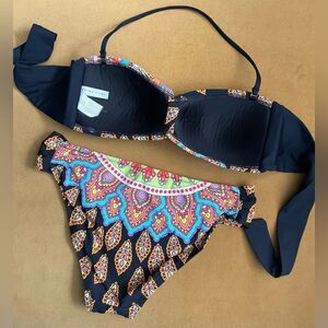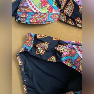 Vibrant bikini with intricate patterns. Features a bandeau top and matching bottoms. Perfect for a stylish beach day.