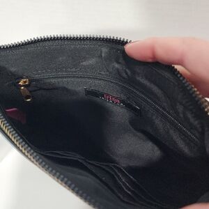 Brand new! This gorgeous Trina Turk faux saffiano leather wristlet with matching cardholder features gold hardware and comes as a boxed set, making it a great gift!