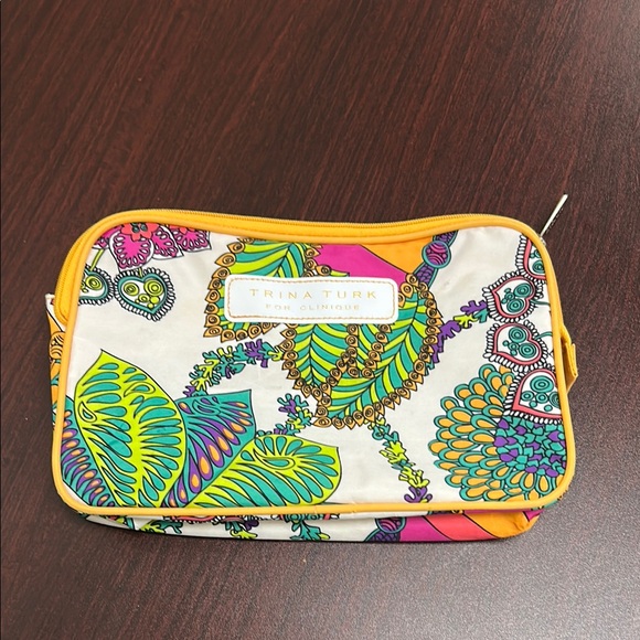 Stylish Trina Turk pouch with a vibrant pattern. Features yellow, green, pink, and purple accents.