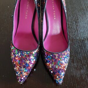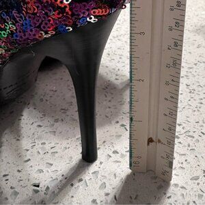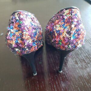 Vibrant sequin heels with a pointed toe. Features a sleek stiletto heel. Perfect for adding sparkle to any outfit.