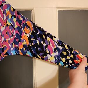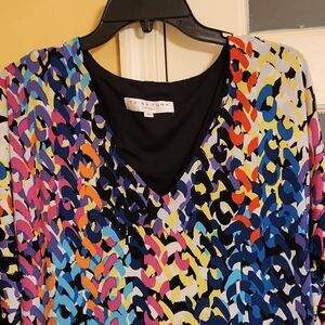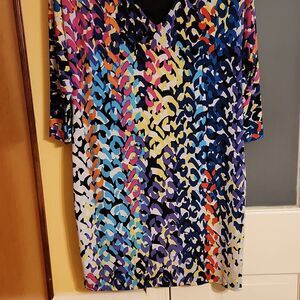 Multicolored dress with 3/4 sleeves and a V-neck.