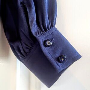 Luxurious silk long-sleeve blouse with cutout collar detail from Trina Turk in navy blue.