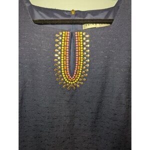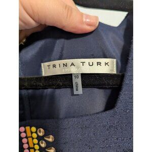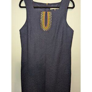 Elevate your wardrobe with the Trina Turk Navy Cotton Sleeveless Shift Dress, a timeless piece that seamlessly transitions from day to night. Size 10 and crafted from 100% cotton, this dress offers both comfort and style, featuring a square neckline that complements its shift silhouette. It's fully lined and includes a convenient zip closure, ensuring a sleek fit.The dress is adorned with beaded, rhinestone, and embroidered accents, adding a touch of elegance to the solid navy design. Perfect for various occasions, from business meetings to cocktail parties or weddings, this midi dress measures 37 inches in length, with a pit to pit width of 17.5 inches and a waist of 34 inches. It's recommended to dry clean only to maintain its quality.