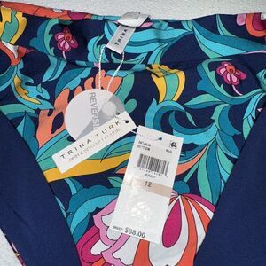 This is a Trina Turk high-waisted swim bikini bottom in a multicolor floral pattern. It is reversible, featuring a garden theme and made in India. The size is regular 12 for women.
