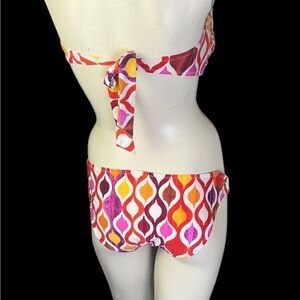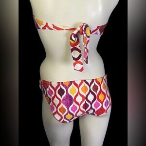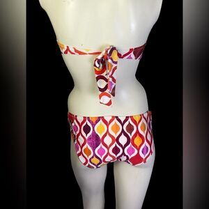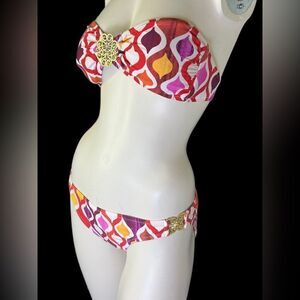 This vintage-inspired print, Ogee, is stunning in red, yellow, maroon, orange and hot pink, and features gold medallions on each hip and in the middle of the bandeau top. From Palm Springs designer Trina Turk, this gorgeous 2-piece bathing suit is 87% nylon and 13% spandex, and is a size 8, both top and bottom.