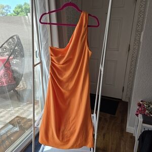 Elegant one shoulder design. Vibrant orange color. Perfect for any occasion.